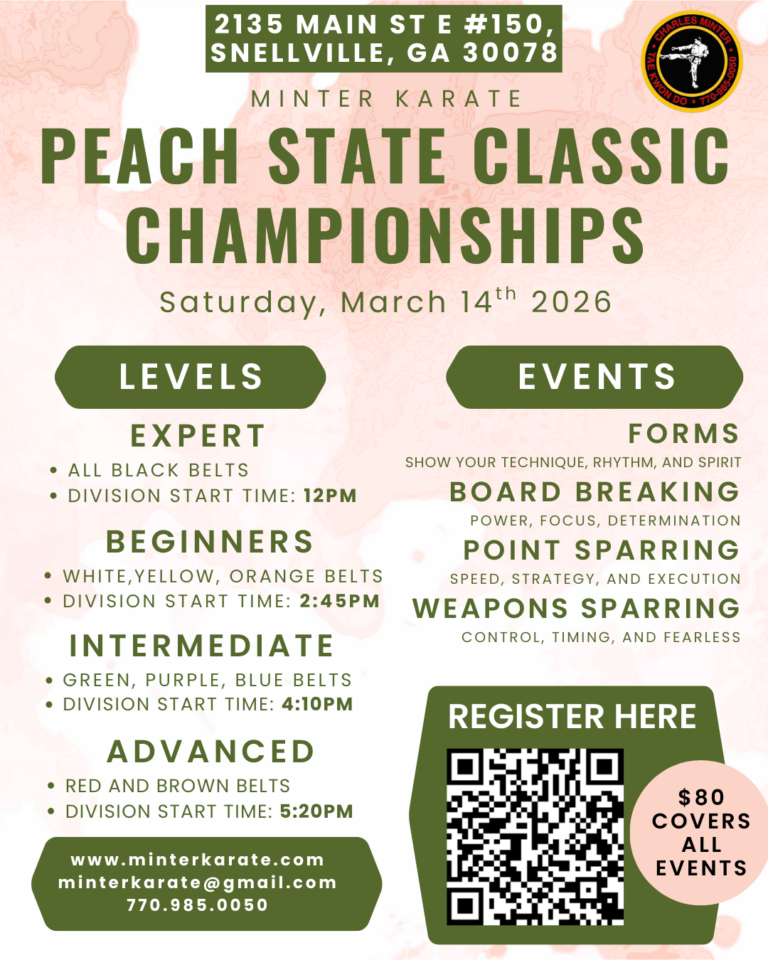 Join us on Saturday, March 14th at Charles Minter Karate Studio for a day packed with exciting events—Forms, Board Breaking, Foam Swords, Point Sparring & Weapons Sparring!